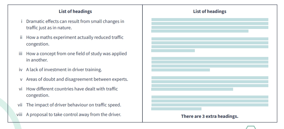 В задании вы увидите перечень заголовков с римскими цифрами и ряд вопросов внизу. Вам нужно подобрать соответствующий заголовок для каждого абзаца (части текста). Иногда часть текста — это абзац, или она может содержать несколько абзацев. Перед вами всегда будет больше заголовков, чем абзацев, например, семь абзацев и восемь заголовков или восемь абзацев и девять заголовков. Это также означает, что некоторые заголовки не будут использоваться. Помните, что каждый заголовок можно использовать только один раз.